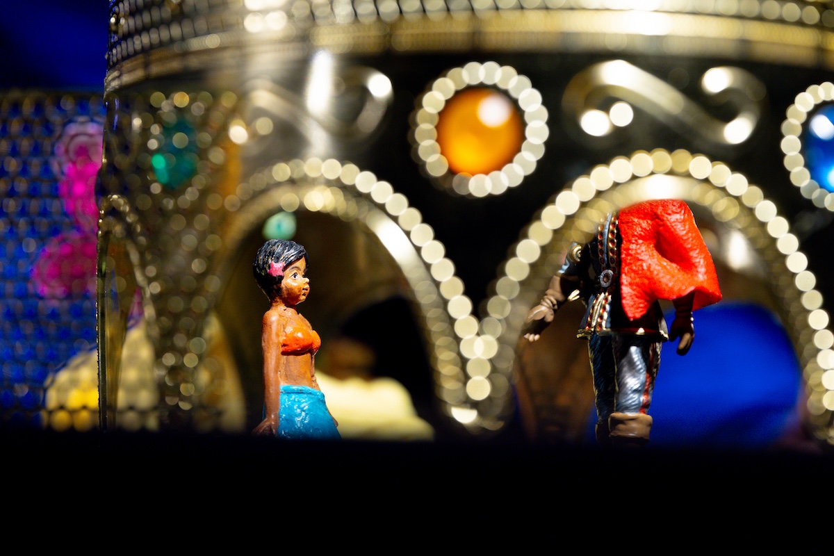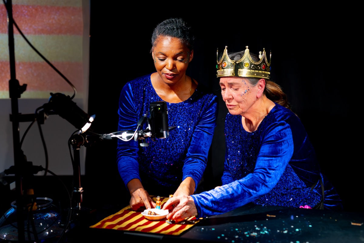A. P. : En théâtre d’objet, on utilise beaucoup l’écriture de plateau et l’improvisation, puisque les images créées avec les objets permettent de raconter sans utiliser les mots. On doit donc trouver le bon apport entre ce qui est dit, et ce qui est montré à l’aide de l’objet, quelle métaphore cet objet représente. Pour l’univers du conte, très imagé, ce procédé narratif est parfait. Cela faisait longtemps que je voulais explorer la vidéo en théâtre d’objet, depuis un laboratoire auquel j’ai participé avec la Pire Espèce, et où j’ai rencontré Chloe Ziner de la compagnie Mind of A Snail, qui travaille sur le spectacle en tant que consultant·e vidéo et marionnettes d’ombres. Dans Petite Ondine, l’utilisation de la caméra nous permet de plonger dans l’intimité du personnage principal, Petite Ondine, et de Petit Prince. L’écran nous permet aussi d’atteindre un plus grand public : en tournée dans les écoles, nous jouons parfois pour plus de 350 élèves, dans des gymnases ou des salles de spectacle spacieuses. Tout ce qui se passe sur la table avec les objets miniatures gagne donc en visibilité avec la vidéo. Les jeux d’ombre, quant à eux, soulignent le côté magique et féerique de l’histoire.